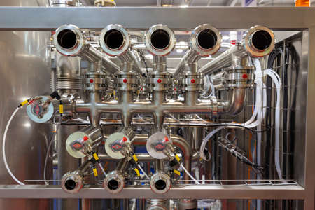 Matrix of mixproof separation valves in modern food or chemical factory.