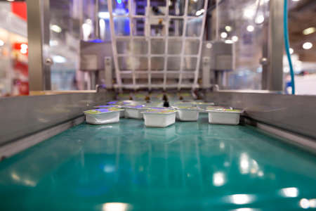 Production and bottling of kefir in dairy production, background, close-up, confectionery factory