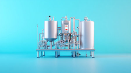 A high-tech liquid processing unit with gleaming steel pipes and glass columns operates in a sterile, sunlit laboratory, monitored by precise gauges and a digital panel.