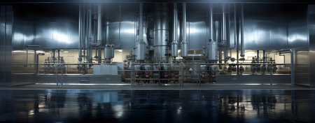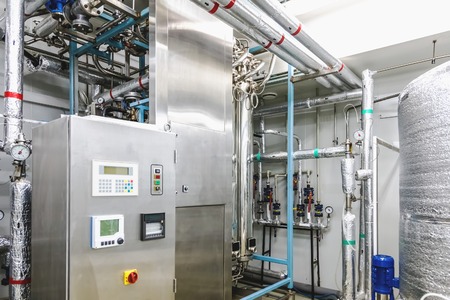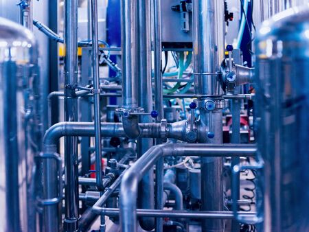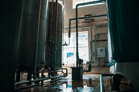 Industrial interior of water factory production. Steel tanks or valves for water filtration and pipeline. Industry background.
