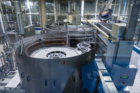 Beer production line. Equipment for the staged production and bottling of the finished product. Special industrial technological device at the factory