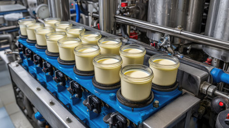 This photo showcases an advanced dairy production line with jars of fresh milk neatly arranged on a conveyor belt in a modern facility, emphasizing efficiency.