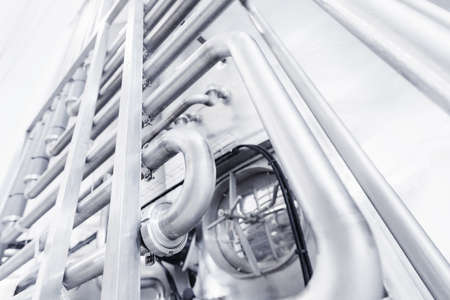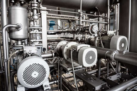 Modern chemical production. Equipment, cables and piping found inside in manufacture background