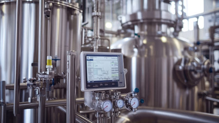 Drug mixing tanks with digital sensors showing temperature, pressure, and ingredient ratios
