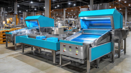 A sleek industrial food processing setup featuring bright blue machinery in a spacious factory. The equipment demonstrates advanced technology for streamlined production and sanitation.