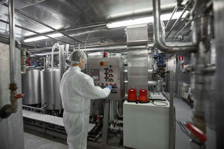 Back view portrait of female worker operating machine units at clean food production factory, copy space