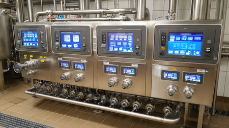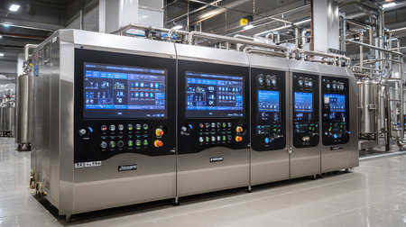 This image features a modern industrial control panel with touchscreen interfaces, showcasing advanced technology in manufacturing and automation for optimal precision and efficiency.