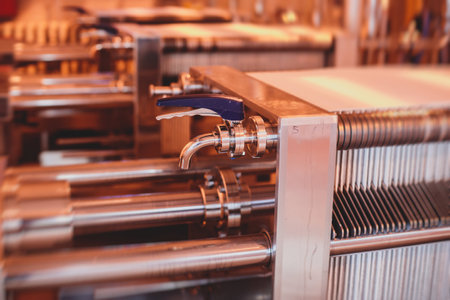 A detailed view of industrial brewing equipment in a modern brewery setting, showcasing the process of beer production.