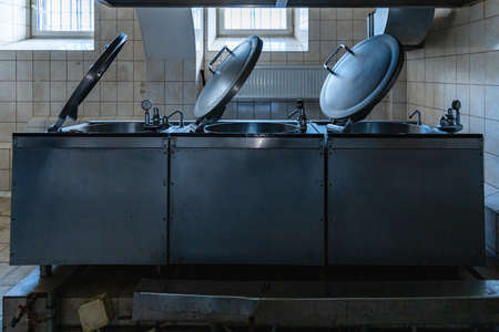 A modern industrial kitchen featuring stainless steel equipment and large mixing bowls. Ideal for food preparation, manufacturing processes, and maintaining hygiene standards.