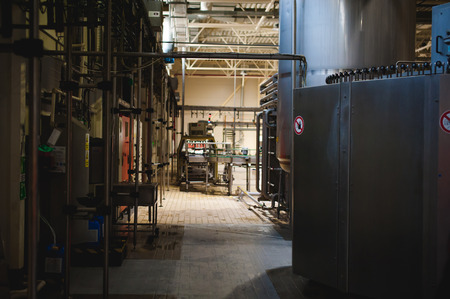 Modern interior of a brewery. Barrels and pipes. Factory interior. Industry background