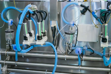 Teat cups of automated cow milking suction machine at cattle dairy farm, exhibition, trade show. Farming, automated technology equipment, agriculture industry, animal husbandry concept