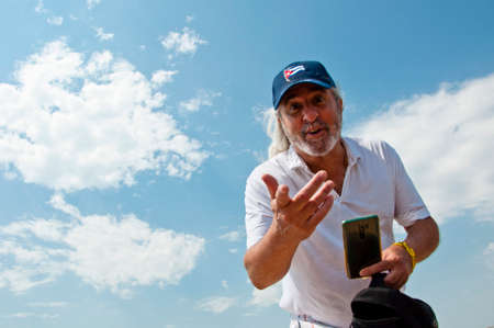 senior grizzled male with long gray hair on island of freedom. copy space. happy cuban man in cap with national flag. sense of freedom and happiness. laughing old man hold phone at beach.