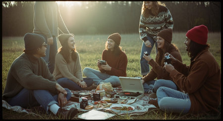 A group of young adults sit and stand together outdoors, enjoying each other's company with books, drinks, and a camera, set against a bright sky.