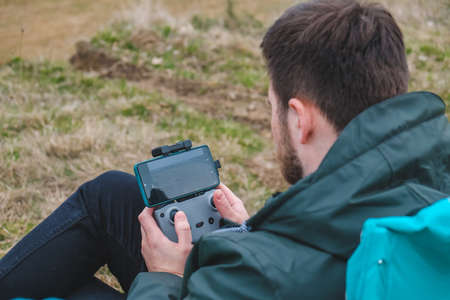 man with drone controller aerial shooting copy space