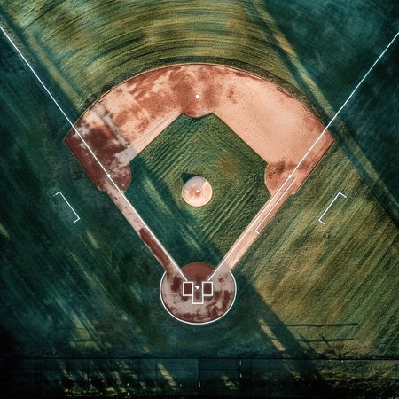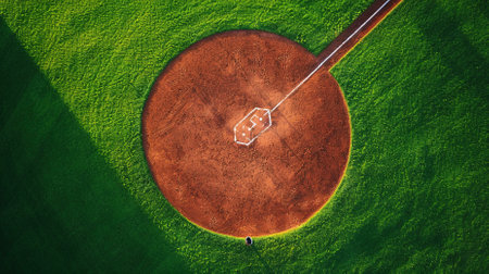 Aerial Drone view of kids play Baseball Field at Park on Sunny Day. Top view
