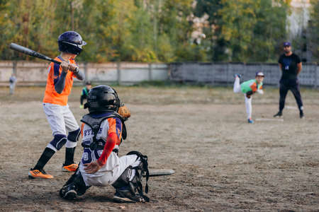 Kyiv, Ukraine - June 3, 2020: Small league, the baseball player is preparing to hit the ball