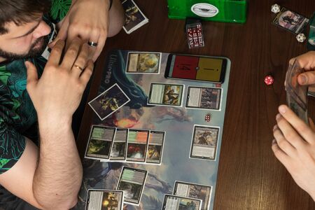SOCHI, RUSSIA-MAY 17, 2019: Young hipster with a beard holding Magic cards The Gathering