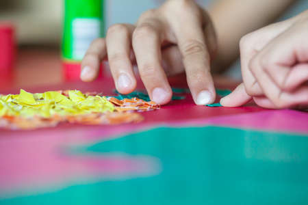 Fingers smooth the paper. Children's hands make the application. The boy's hands close up make a flower out of paper. Children's entertainment. A class for children.