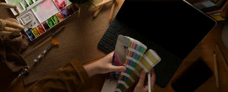 Overhead shot of female designer choosing colour on colour swatch while working with tablet on wooden table