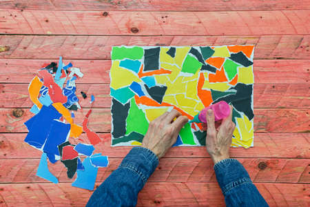 At a lesson of the fine arts. The school student does abstract application, of multi-colored sheets of paper
