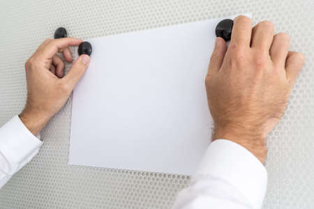 Closeup view of businessman clipping blank white sheet of paper with two black magnets on white magnetic board.