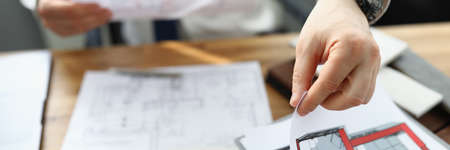 Mature man's hand points to a piece of paper with a pencil. Empty red square piece of paper fixed to the wall. An abstract light and shadow drawing on a gray plastered wall. selective focus. low key.