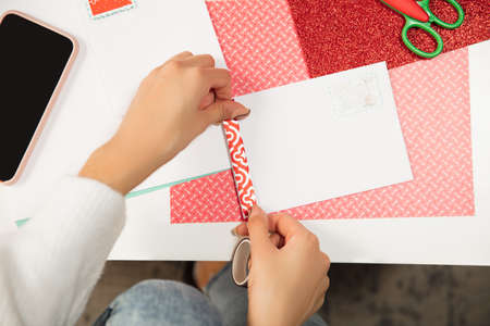 Close up female hands making greeting card for New Year and Christmas 2021 for friends or family, scrap booking, DIY. Writing a letter with best wishes, design her homemade card. Holidays, celebration.