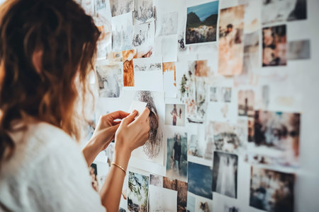A woman engaged in creative scrapbooking at a wooden table surrounded by photos and materials in a cozy indoor workspace during daylight