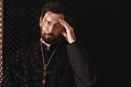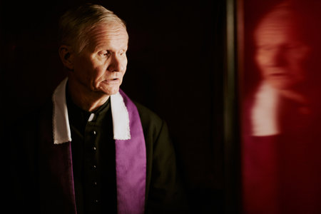 Medium closeup of senior Caucasian Catholic priest talking to penitent in confessional, copy space