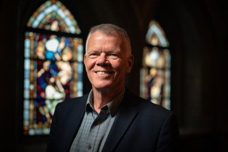 A joyful clergyman stands in a serene church interior, holding a Bible. The warm atmosphere and beautiful stained glass windows enhance this moment of faith and devotion.
