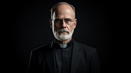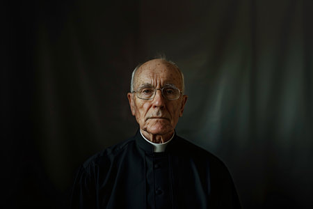 Vertical low key medium closeup portrait of elderly Caucasian Catholic priest looking at camera