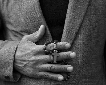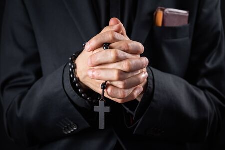 Christian person praying, low key image. Hands of a man in black suit or a priest portraying a preach