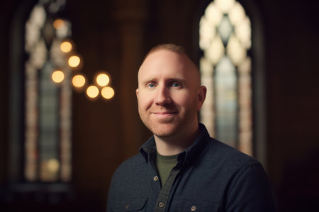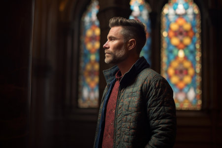 Priest is pointing towards the bright light shining through stained glass windows of a church during a sermon, creating a powerful atmosphere of faith and spirituality