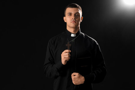 image that focuses on the partial view of a Catholic priest wearing a silver cross on a necklace, set against a striking black background.