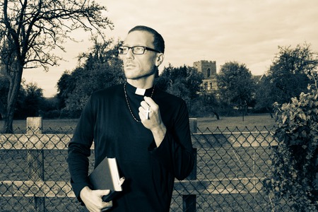 Handsome priest wearing glasses and holding bible with alpaca in field behind him