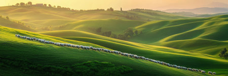 A flock of sheep traverses lush green hills under soft morning light, capturing a peaceful rural setting with cinematic depth and tranquility.
