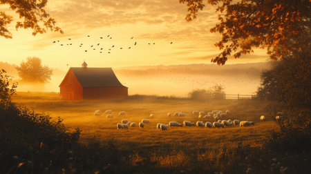 A serene farm scene at sunrise with a flock of sheep grazing in a misty field, a red barn in the distance, and golden light softening the landscape