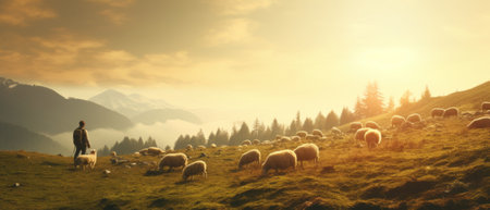 A Serene Shepherd Tending to Grazing Sheep. Majestic Mountain Pastures
