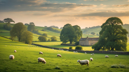 Verdant rolling hills, Idyllic countryside with grazing sheep and vibrant meadows.