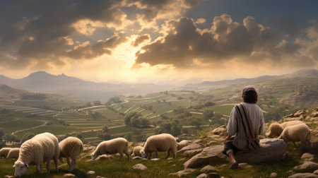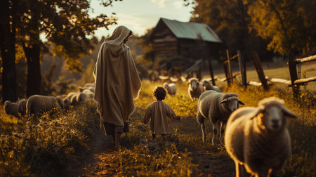 Capturing serenity: a tender portrayal of the little child Jesus Christ herding sheep, an endearing and symbolic scene embodying innocence, faith, and the pastoral charm of the biblical narrative.