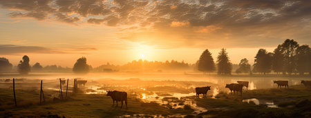 Panorama of grazing cows in a meadow with grass covered with dewdrops and morning fog, and in the background the sunrise in a small haze