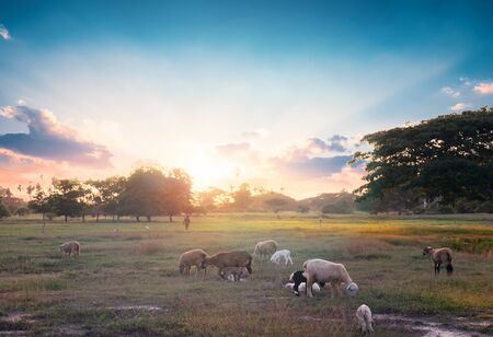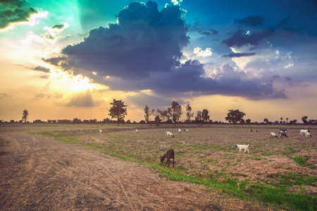 View of sunset sky over goat farm and herd of goat grazing grass on the field.
