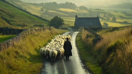 Shepherd leading sheep along a narrow country road generative ai