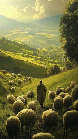 The lord as shepherd a peaceful flock under god s care in lush fields and rolling hills