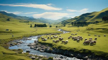 Generative AI, Beautiful green mountains landscape with flock of sheeps grazing on lush grass on farmland