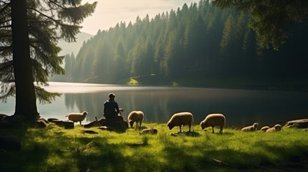 the shepherd with sheep in the deep forest on the grass beside a lake with beautiful sunlight