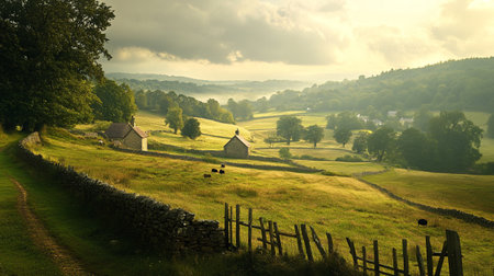 idyllic countryside, featuring a charming farmhouse nestled among rolling hills, and a meandering stream inviting contemplation and relaxation. Generative AI