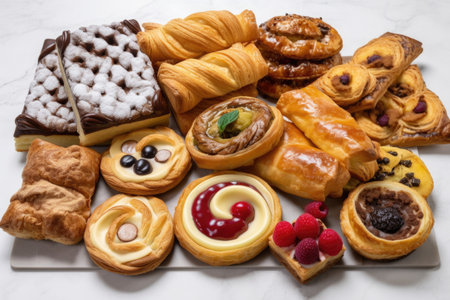 a beautifully arranged food display, with an array of pastries and baked goods, created with generative ai
