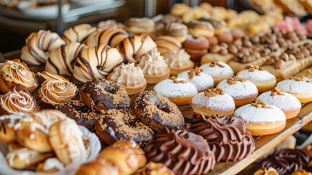Delicious pastries displayed in a cozy bakery during the morning hours inviting customers to indulge in sweet treats. Generative AI