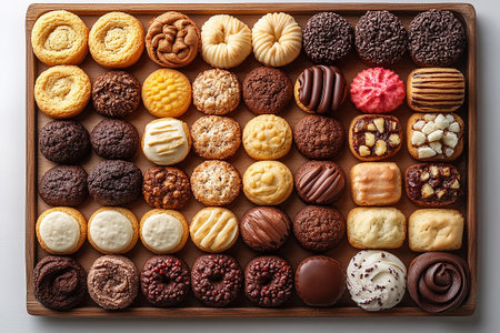 A vibrant assortment of baked goods elegantly arranged in a rustic wooden tray, showcasing an inviting selection of desserts perfect for any gathering.
